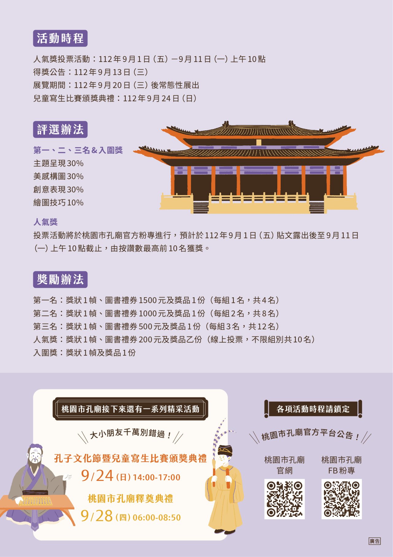 三、 | 檢附112年桃園市孔廟兒童寫生比賽活動宣傳電子檔,活動訊息請洽本所粉絲專業最新活動消息頁面:https://www.facebook.com/tycg.confuciustemple1/。 |